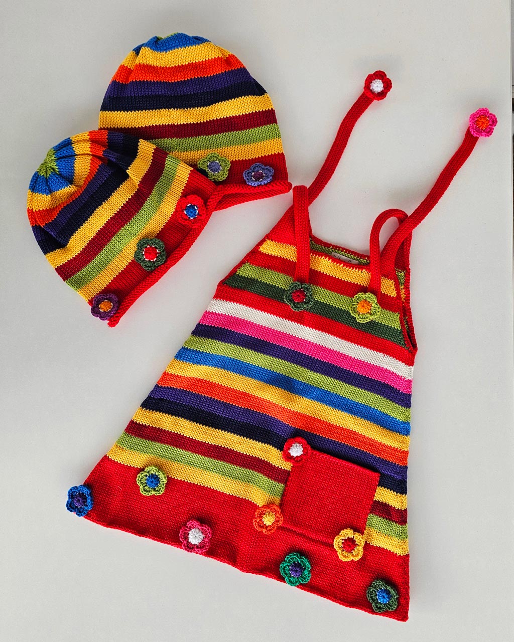 Ovaj set haljine i torbice za djevojčice spaja udobnost i šarm. Haljina ima ručno heklanu aplikaciju za lutku sa živopisnim detaljima od pređe. Odgovarajuća torbica odražava istu razigranu temu, stvarajući potpun i usklađen izgled.