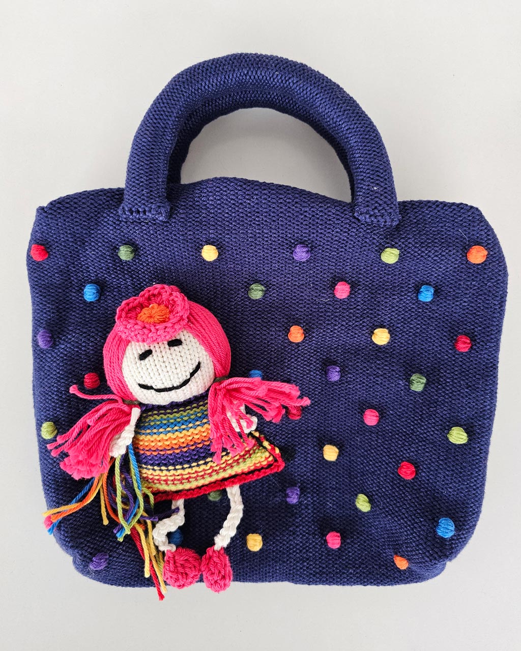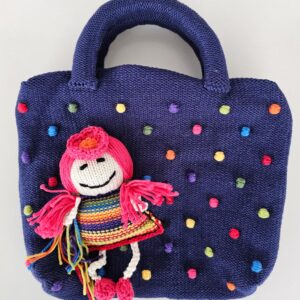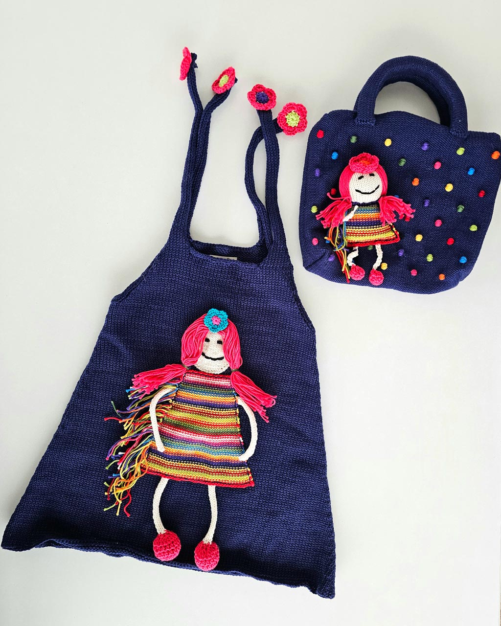 Ovaj set haljine i torbice za djevojčice spaja udobnost i šarm. Haljina ima ručno heklanu aplikaciju za lutku sa živopisnim detaljima od pređe. Odgovarajuća torbica odražava istu razigranu temu, stvarajući potpun i usklađen izgled.